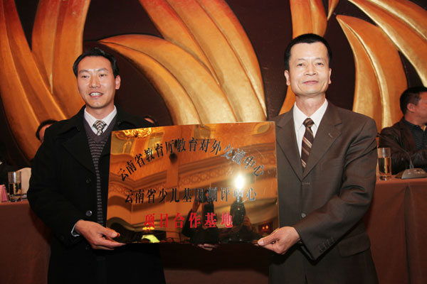 云南省教育廳外事處調(diào)研員、基因測(cè)評(píng)中心主任劉超(右)向安寧市好孩子教育培訓(xùn)學(xué)校校長(zhǎng)魯植(左)授牌