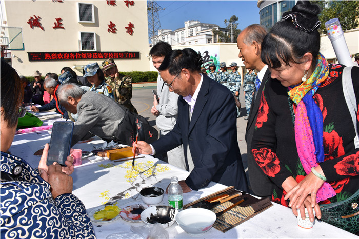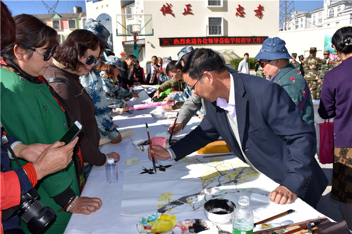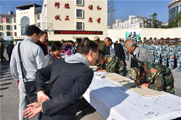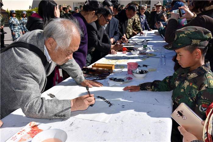 緊接著,聽(tīng)說(shuō)老領(lǐng)導(dǎo)們都身懷絕技,在繪畫(huà)、書(shū)法上都頗有造詣,孩子們豈能錯(cuò)過(guò)這樣的好機(jī)會(huì)。在領(lǐng)導(dǎo)們觀看教學(xué)片時(shí),孩子們?cè)缭缇桶压P墨紙硯準(zhǔn)備好,列隊(duì)等著請(qǐng)教學(xué)習(xí)。領(lǐng)導(dǎo)們觀看結(jié)束,一出教學(xué)樓就看著齊排排的學(xué)生圍在書(shū)法桌周?chē)却麄儯膊唤d致勃勃想檢驗(yàn)下孩子們的日常所學(xué)。