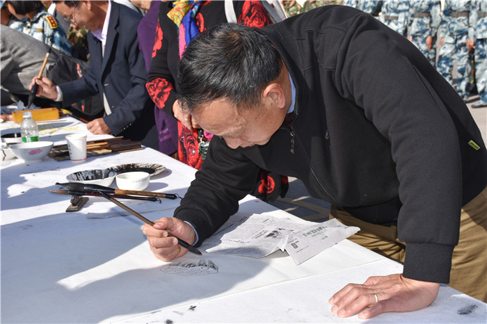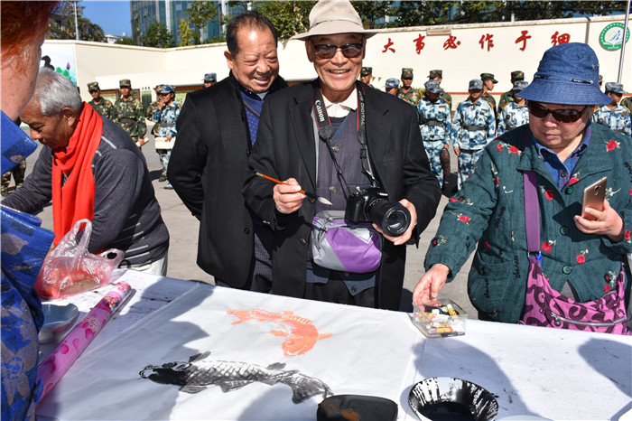 孩子們書(shū)寫(xiě)展演結(jié)束,都想一睹大師風(fēng)采。老領(lǐng)導(dǎo)們也毫不吝嗇地?fù)]毫潑墨,起筆、運(yùn)筆、收筆,一氣呵成。只見(jiàn)筆墨飛舞間,一幅幅遒勁有力、氣勢(shì)非凡的的書(shū)法作品就呈現(xiàn)在大家眼前,令人賞心悅目。桌子的另一端,有的領(lǐng)導(dǎo)也在凝神繪畫(huà)。有的畫(huà)奔騰的駿馬、有的畫(huà)自由的金魚(yú)、有的畫(huà)高潔的竹子、有的畫(huà)春意盎然的迎春花、有的畫(huà)出淤泥而不染的荷花......現(xiàn)場(chǎng)非常熱鬧,同學(xué)們紛紛擠上前去觀摩。不一會(huì)兒,一幅幅活靈活現(xiàn)的水墨畫(huà)躍然紙上,同學(xué)們贊口不絕,紛紛想要收藏。盡管領(lǐng)導(dǎo)們的畫(huà)美艷一絕,但值得一提的是,我們的學(xué)生也大膽上臺(tái)表現(xiàn),所畫(huà)的荷花得到一致稱贊,紛紛表示功底深厚,甚至還十分謙虛地說(shuō)要向她學(xué)習(xí)。