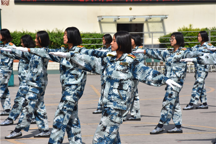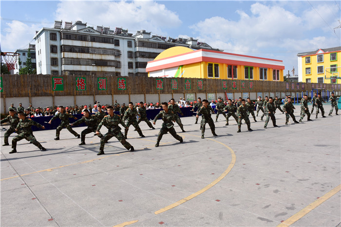 在教官的帶領(lǐng)下,我校男女生隊列、軍體拳、匕首操、葫蘆絲合奏《荷塘月色》、《女兵操》、手語《我相信》等方隊相繼出場。隊列方隊的同學(xué)們精神飽滿、口號響亮、步伐鏗鏘、隊形整齊,展現(xiàn)了良好的精神風(fēng)貌;軍體拳方隊的表演也深深吸引了大家的眼球,出拳帶風(fēng),出腿起塵,踢腳勾拳,嫻熟連貫,帥氣瀟灑,被同學(xué)們演繹得淋漓盡致;匕首操方隊的同學(xué)們也毫不遜色,一招一式,一起一落,剛勁有力,展現(xiàn)了頑強(qiáng)拼搏和勇做時代弄潮兒的決心;葫蘆絲合奏的《荷塘月色》,清幽典雅,跟著旋律有如身臨其境,仿佛有種荷塘晚風(fēng)吹拂的清涼,一幅夏日荷塘月色的動人畫卷頓時呈現(xiàn)在大家眼前,也傳遞出孩子們對淡雅事物的美好追求;《女兵操》表演剛?cè)岵?jì),歡快向上,展示出孩子們的健康與活力。