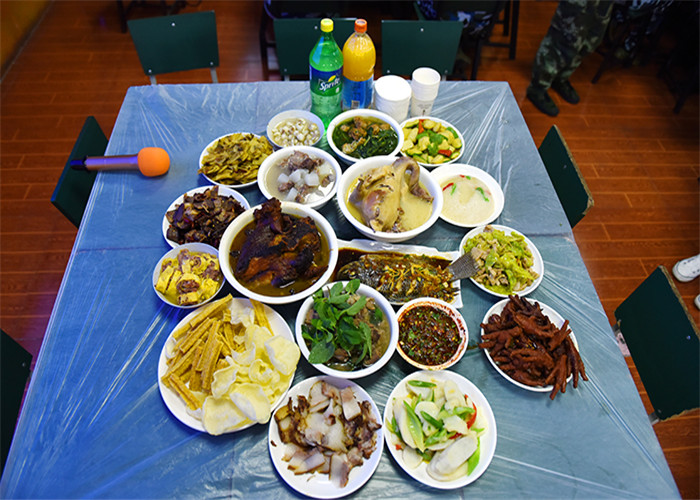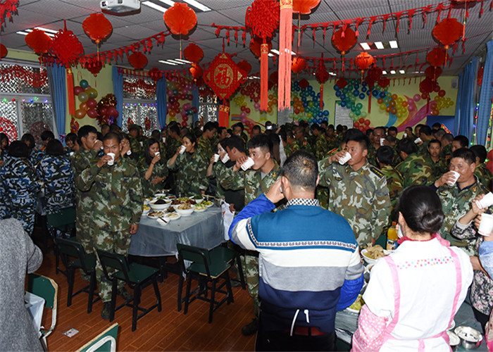 為了準(zhǔn)備豐富的年夜飯,老師和同學(xué)們從上午就開始忙碌著,一起幫著學(xué)校廚師們打著下手。到了下午,一盤盤色香味俱全的菜肴就呈現(xiàn)在大家面前了,伴隨著隆隆的鞭炮聲,年夜飯開始了。