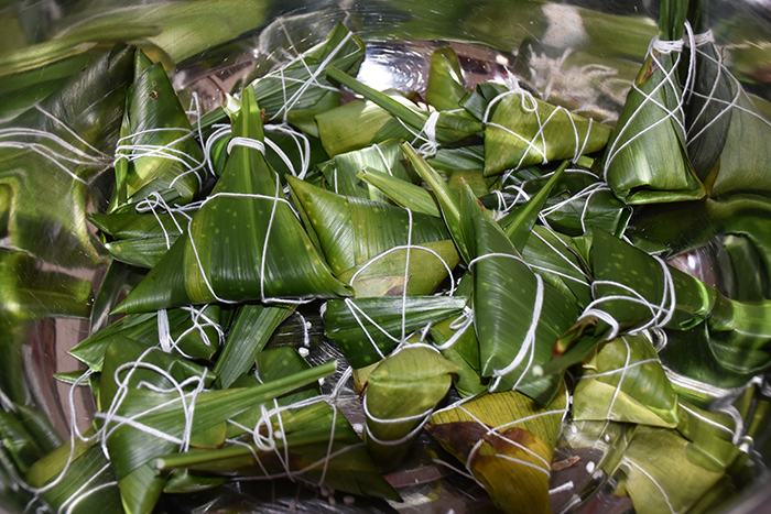早點(diǎn)過后,師生們準(zhǔn)備好了所有材料,同學(xué)們?cè)诶蠋煹闹笇?dǎo)下,清洗粽葉,準(zhǔn)備包粽子。不一會(huì)兒,所有材料準(zhǔn)備就緒,大家就開始包起粽子。細(xì)長的粽葉在師生們靈活的手指下團(tuán)成漏斗狀,糯米合著花生、火腿被包進(jìn)粽葉中,一根根細(xì)彩線纏繞在粽子上。折粽葉、填糯米、裹葉子、系線,一時(shí)間粽葉飛舞,絲線穿梭,一個(gè)個(gè)玲瓏而秀氣的粽子不一會(huì)兒便誕生了,在這過程中,大家還交換了如何把粽子包的更漂亮、更有型的心得。大家一邊包粽子,一邊分享著端午這一傳統(tǒng)節(jié)日的故事。活動(dòng)現(xiàn)場一片歡騰,笑聲連連,整個(gè)餐廳沉浸在一片歡樂的海洋里。