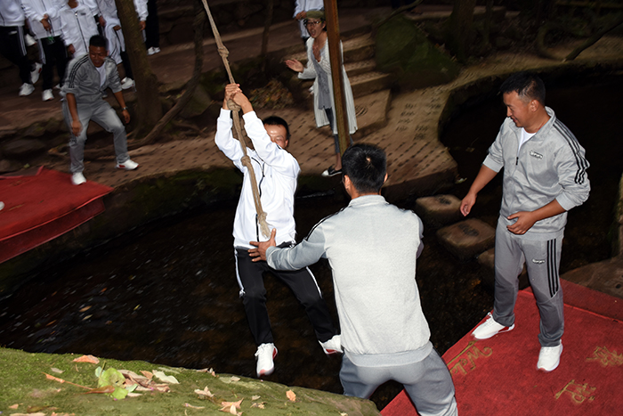 在老師們的帶領(lǐng)下,大家沿著山間的石板路,首先到達(dá)了第一個(gè)項(xiàng)目挑戰(zhàn)點(diǎn)——水上蕩繩(也叫笑料陷阱),孩子們?cè)诶蠋煹哪托闹v解和示范后,相繼進(jìn)行了挑戰(zhàn)。有的身輕如燕,一躍而過;有的驚險(xiǎn)蕩過,虛驚一場;有的蜻蜓點(diǎn)水,老師巧妙護(hù)住。孩子們玩得不亦樂乎,久久不肯離去。隨后,孩子們?cè)凇皪{谷森林最美拓展大本營”又開始了一系列的高空挑戰(zhàn)項(xiàng)目,體驗(yàn)了這條“最美森林冒險(xiǎn)之旅”的花籃跳、折疊橋、葵花笑、半月橋、時(shí)光隧道、鐵索連環(huán)、生命之門、單側(cè)過網(wǎng)等30個(gè)驚險(xiǎn)刺激關(guān)卡。腳下是清澈的山澗溪流,身旁是彩蝶翩躚,藤蔓纏繞,置身這仙境般般的大自然,孩子們的笑聲格外清脆。