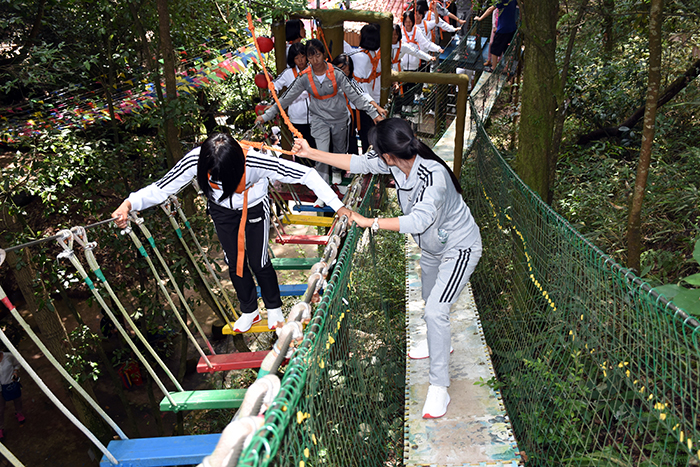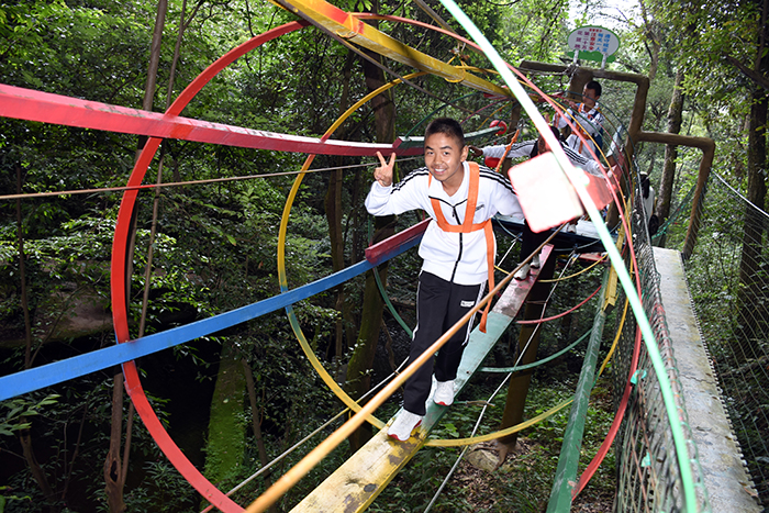 這是全國首個(gè)在峽谷森林中獨(dú)創(chuàng)、全程網(wǎng)絡(luò)化管理運(yùn)行的拓展大本營,全長286米,全程趣味十足。雖然在挑戰(zhàn)過程中,有的孩子有過膽怯、有過害怕,但在老師們響亮的加油打氣聲中,在同學(xué)的互幫互助下,孩子們沒有一個(gè)退縮、沒有一個(gè)放棄,憑借著頑強(qiáng)的毅力、堅(jiān)定的信念,全部通過了重重難關(guān)考驗(yàn)。