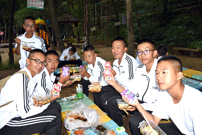 很快到了午餐時(shí)間,老師們把早早就精心準(zhǔn)備好的各種美食(涼卷粉、海帶絲、糕點(diǎn)、飲料等)分發(fā)到每一位孩子手中。雖然一早的挑戰(zhàn)項(xiàng)目讓大家有了些許疲憊,但在美食面前,在涼爽的綠蔭下,孩子們一個(gè)個(gè)像小饞貓一樣開心地吃起來,所有的勞累頓時(shí)煙消云散。