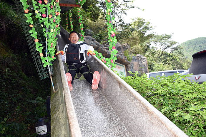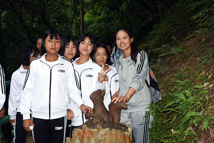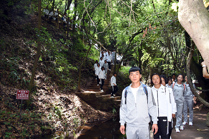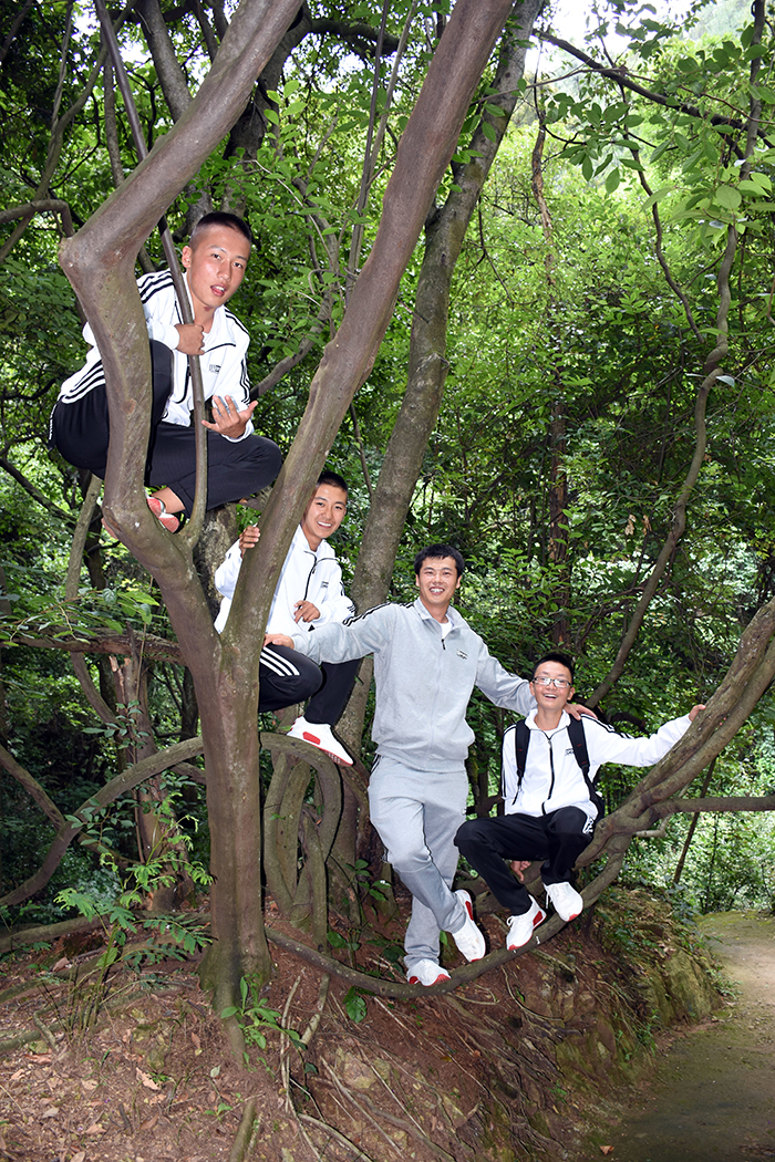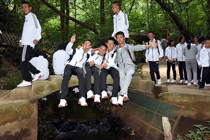 下午進(jìn)行的是“叢林穿越”。孩子們分為兩列縱隊(duì)興高采烈地沿溪而上,一條長龍穿梭在山谷之中,和煦的陽光透過稠密的樹葉灑落下來,點(diǎn)點(diǎn)金色的光斑倔強(qiáng)地映照在孩子們喜笑顏開的臉上,清脆的歡笑聲在山谷間回蕩。大家邊走邊在自己喜歡的地方,擺出不同的姿勢,和小伙伴們留下最珍貴的回憶。清幽的山谷,呈現(xiàn)出一幅人與自熱和諧相處的畫面。