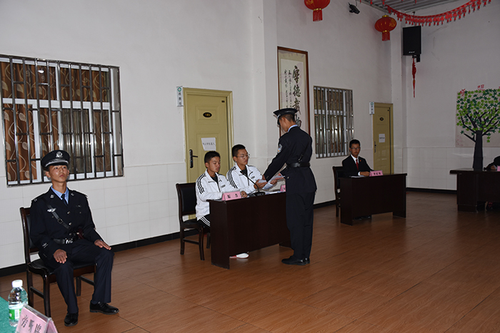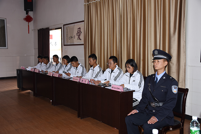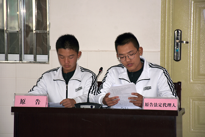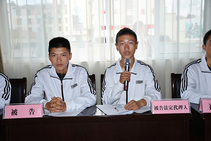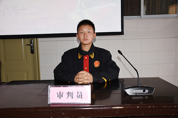 上午10時,隨著“小法官”一聲清脆的“現(xiàn)在開庭”的法槌聲,一場特殊的庭審活動在學(xué)校多媒體教室正式拉開序幕。由字然等16名學(xué)生分別飾演的審判長、審判員、書記員、原告、原告法定代理人、被告人、被告法定代理人、法警等法庭訴訟角色,開始了莊重、肅穆的庭審。