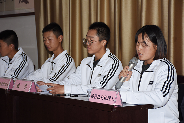 “庭審”中,“審判長”有條不紊、鎮(zhèn)定自若地主持“庭審”,“原、被告”雙方及“法定代理人”舉證、質(zhì)證、激烈辯論,控辯雙方剖析法理,思維敏捷、邏輯嚴(yán)謹(jǐn),“法警”一絲不茍地執(zhí)法。通過庭前準(zhǔn)備、法庭調(diào)查、法庭辯論、合議庭審議到當(dāng)庭宣判,全程模擬了案件審理過程。150余名師生旁聽觀摩,對整個審判流程有了更直觀、更真切、更生動的認(rèn)識。嚴(yán)肅莊重、環(huán)環(huán)相扣的審理過程,讓大家零距離感受到了法律的威嚴(yán),也潛移默化地在心底埋下了一顆法治的種子。