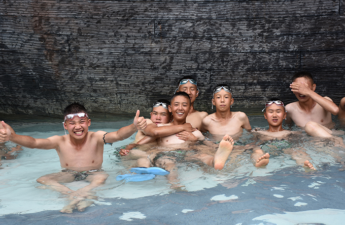 泳池中,同學(xué)們還不時(shí)搞下惡作劇,上一秒還在友好地討論著如何提高游泳技術(shù),下一秒就趁其不備,開(kāi)始了水中的潑水大戰(zhàn),好似在過(guò)潑水節(jié),也讓人情不自禁聯(lián)想到冬天打雪仗的情景。此刻,想象和現(xiàn)實(shí)沒(méi)有差距,在水中,無(wú)論男生還是女生,都玩得不亦樂(lè)乎。游泳池中,顏色明快統(tǒng)一的泳衣,清脆開(kāi)心的歡笑聲,成了溫泉中一道亮麗的風(fēng)景線。說(shuō)來(lái)也神奇,在這樣的氛圍中,之前怯水的同學(xué)不知不覺(jué)就克服了恐懼心理,也能在水中自如地走來(lái)走去。