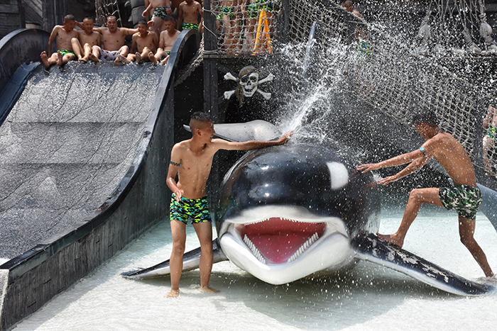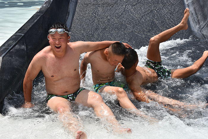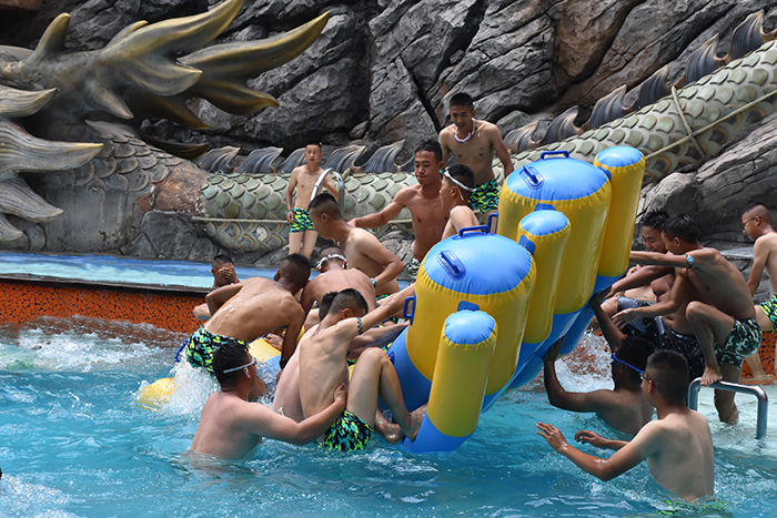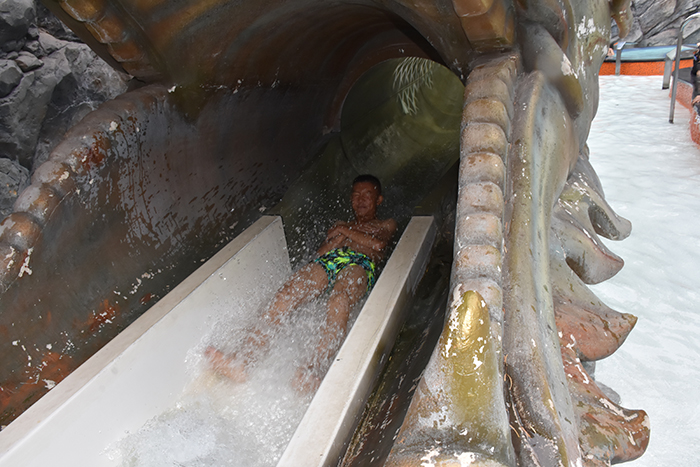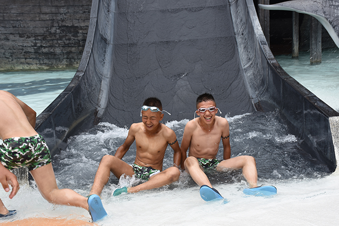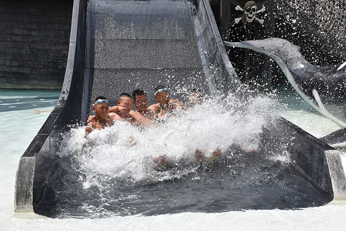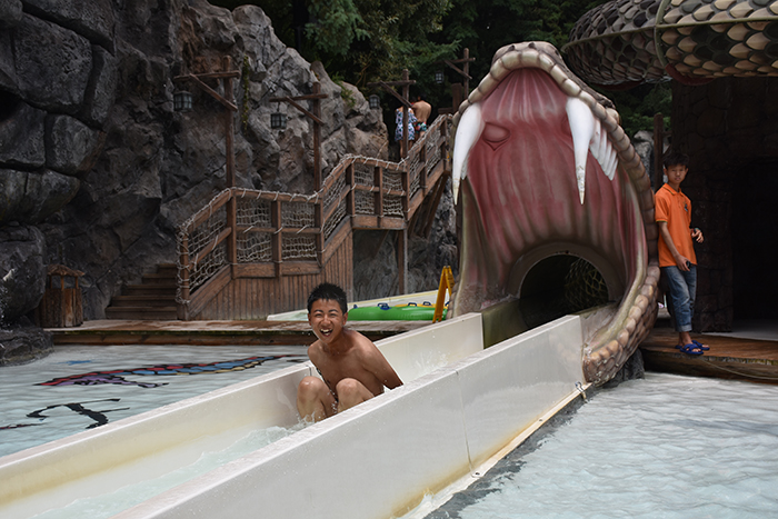 泳池中玩累了,孩子們稍作休息,便又元?dú)鉂M滿地開(kāi)始了各種驚險(xiǎn)刺激的水上項(xiàng)目挑戰(zhàn)。在湍急的出水口,在急速滑下而濺起的浪花中,孩子們開(kāi)懷大笑又有些驚險(xiǎn)的表情被記錄了一次又一次。同一個(gè)項(xiàng)目,一遍又一遍玩耍的熱情,一次又一次開(kāi)心的尖叫,讓我們感受到了孩子們火一樣的青春。
