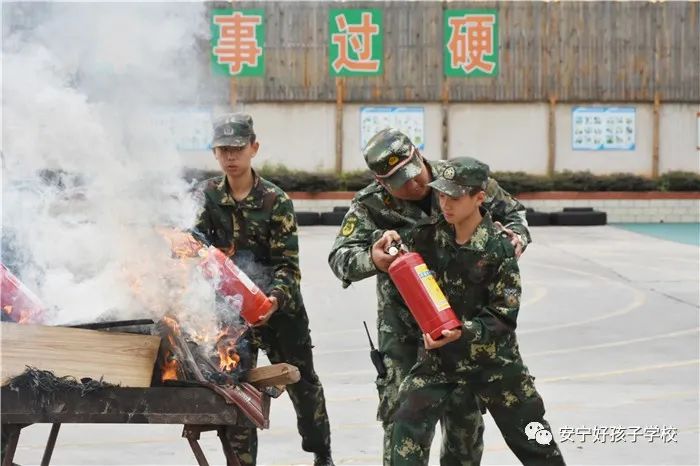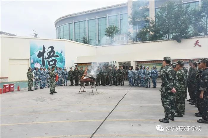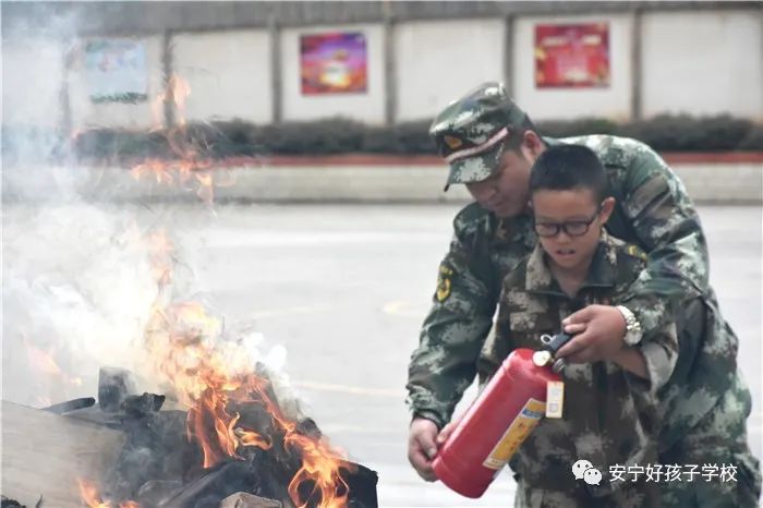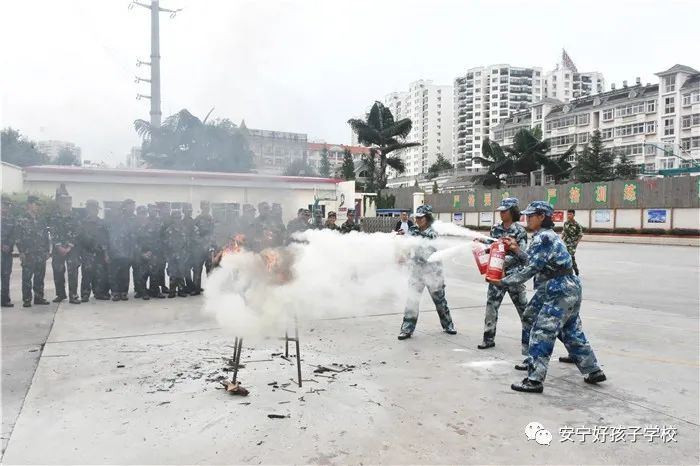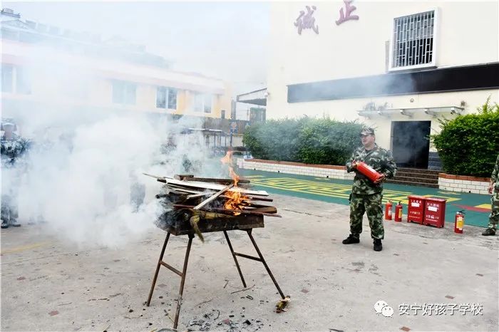 接著開(kāi)始了消防撲救演練。操場(chǎng)上的木材點(diǎn)燃后,火苗迅速變成了熊熊大火,老師開(kāi)始現(xiàn)場(chǎng)演示滅火設(shè)備(滅火器、高壓水槍、滅火毯、濕毛巾)的使用方法,并指導(dǎo)全部學(xué)生親自操作演練。