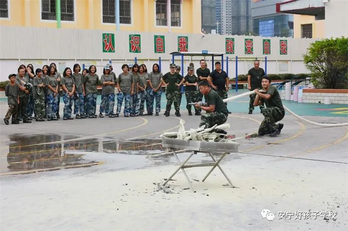 最后,進(jìn)行了撲救演練。操場(chǎng)上的木材點(diǎn)燃后,火苗迅速變成了熊熊大火,老師開始現(xiàn)場(chǎng)演示滅火設(shè)備(滅火器、高壓水槍)的使用方法,并指導(dǎo)全部學(xué)生親自操作演練。