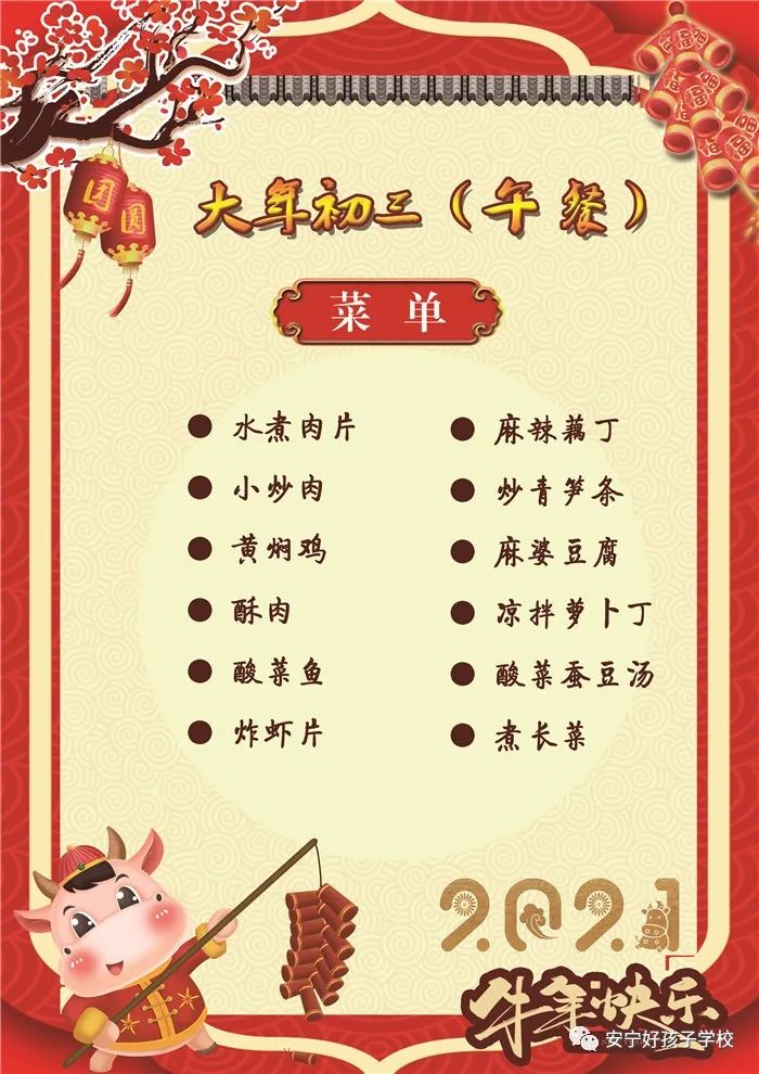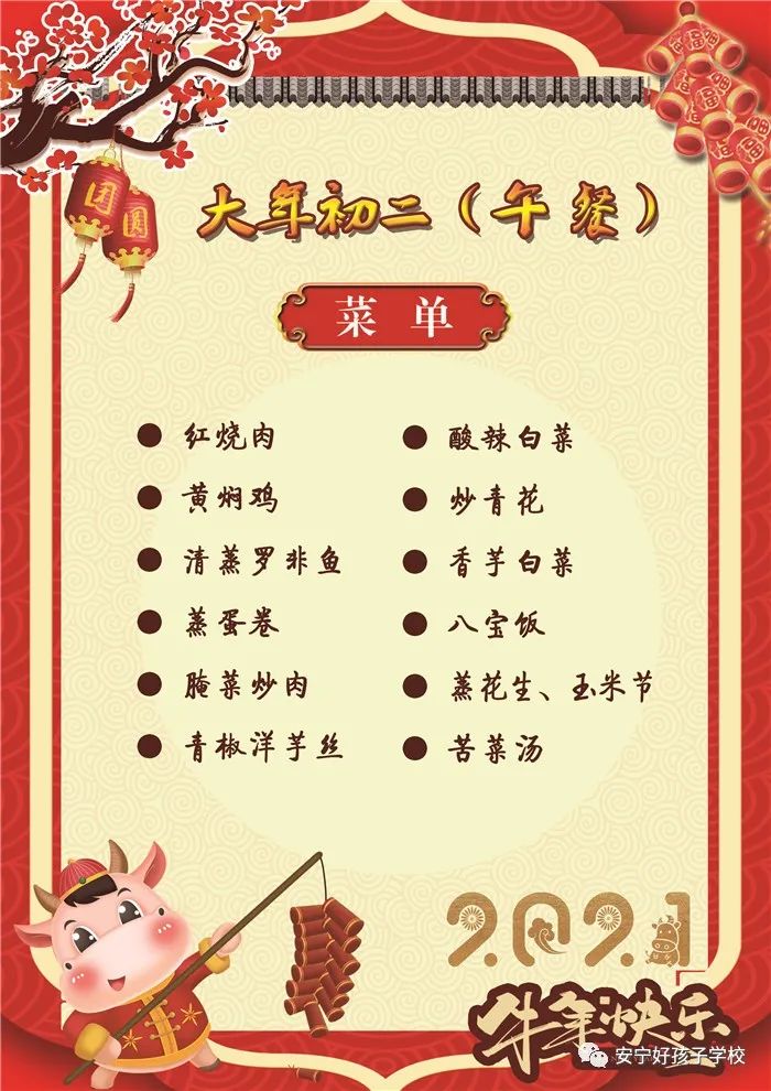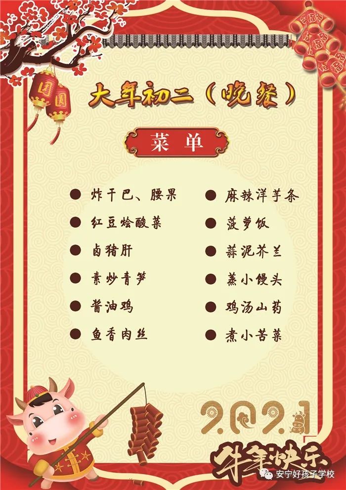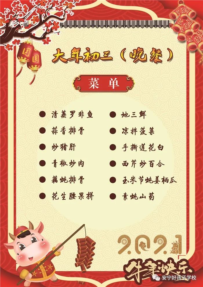 過(guò)年了 !孩子們吃什么?這是學(xué)校領(lǐng)導(dǎo)幾天來(lái)一直思考的問(wèn)題。經(jīng)過(guò)與學(xué)校營(yíng)養(yǎng)師、食堂廚師們多次商議后,本著營(yíng)養(yǎng)、健康、不浪費(fèi),又要保證孩子每餐都能吃上新鮮可口的飯菜,終于議定了菜單,現(xiàn)予以公布。祝孩子們新年快樂(lè)!祝全體家長(zhǎng)萬(wàn)事如意!