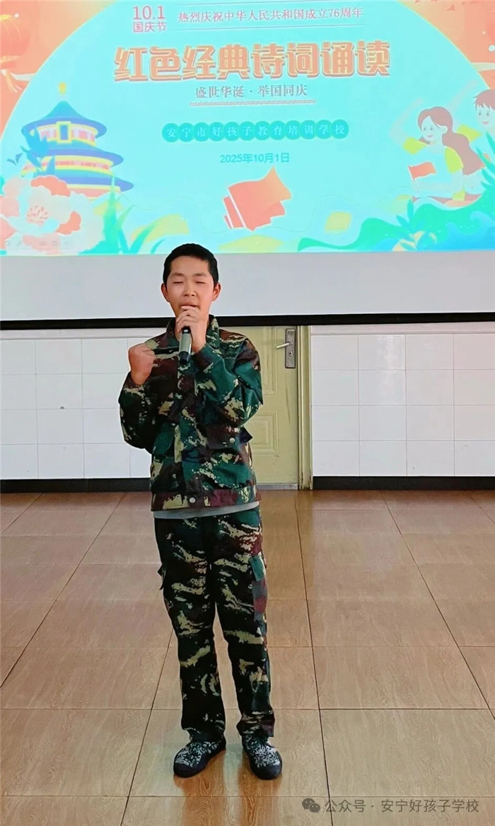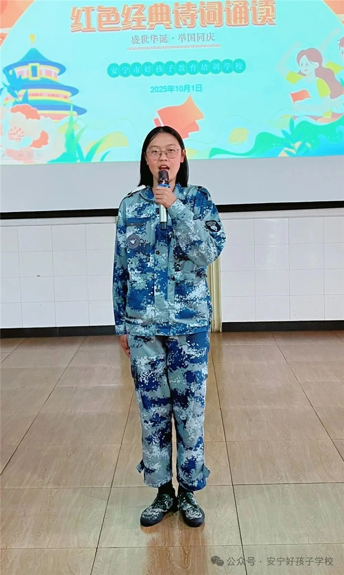 隨后的“紅色經(jīng)典詩詞誦讀”活動(dòng)同樣精彩紛呈。從《沁園春·雪》的豪邁壯闊,到《七律·長征》的堅(jiān)韌不屈;從《少年中國說》的朝氣蓬勃,到《我驕傲,我是中國人》的熱血沸騰...... 同學(xué)們或獨(dú)誦、或合誦,搭配生動(dòng)的肢體語言與情感飽滿的語調(diào),將詩詞里的紅色故事娓娓道來。臺下師生仿佛穿越時(shí)空,在朗朗書聲中重溫革命歲月,讓紅色文化浸潤心靈。